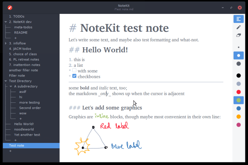This program is a structured notetaking application based on GTK+ 3. Write your notes in instantly-formatted Markdown, organise them in a tree of folders that can be instantly navigated from within the program, and add hand-drawn notes by mouse, touchscreen or digitiser.