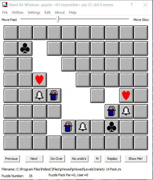 Vexed is a well known puzzle game challenging your ability to plan and think ahead to complete the puzzles made famous on the PalmPilot. Start off easy and work your way to the harder puzzle packs like the 'impossible', 'confusion', or 'panic' packs.